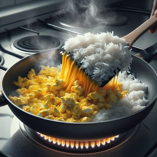 - 계란이 반쯤 익으면 밥을 넣고 빠르게 섞어가며 볶아줍니다.