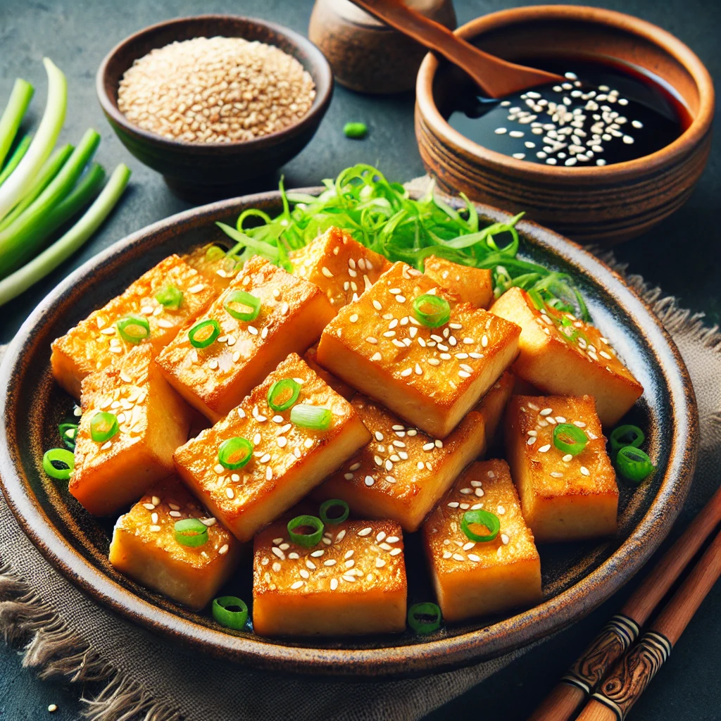 - 구운 두부를 접시에 담고 간장 소스를 곁들여 완성합니다.