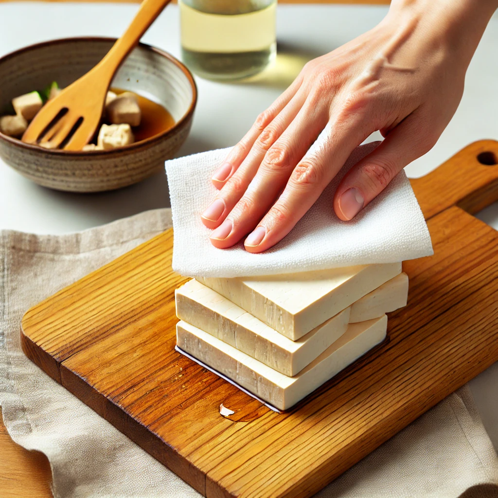 - 두부를 키친타월로 감싸 물기를 제거한 후, 1cm 두께로 썰어줍니다.