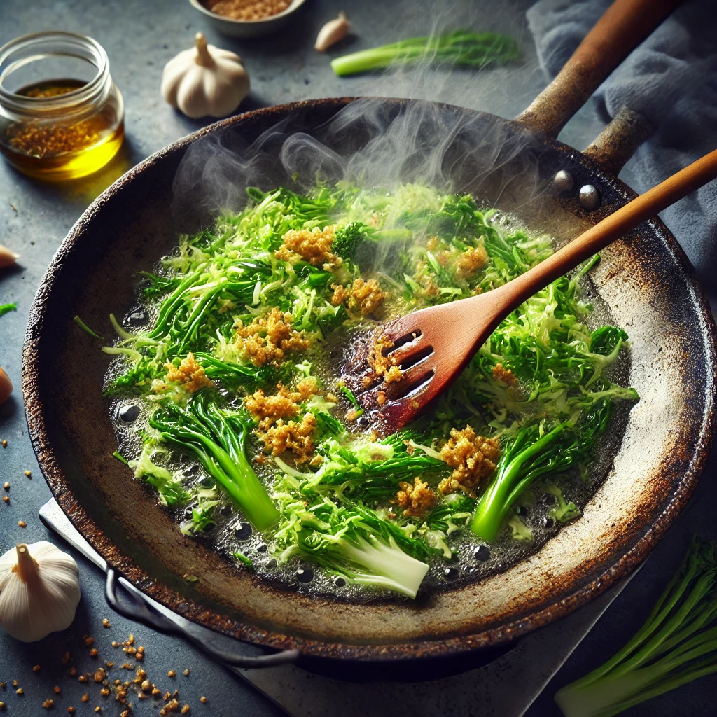 - 팬을 중불로 달군 후 식용유와 다진 마늘을 넣고 볶아 향을 냅니다.