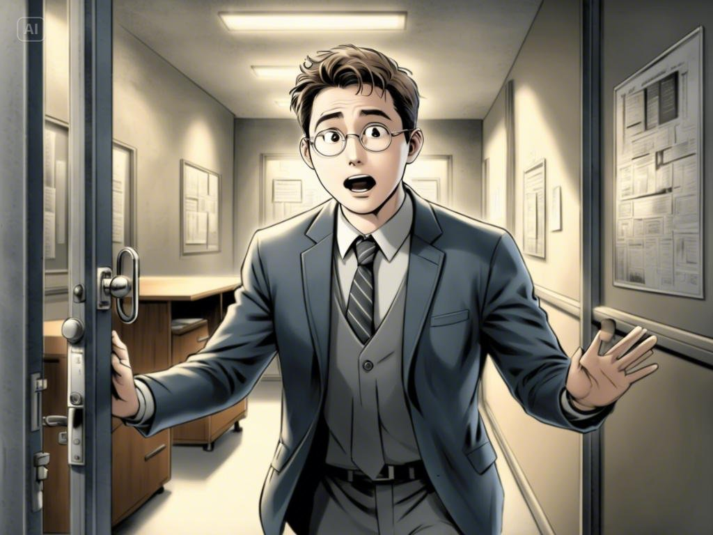 김철수는 정시에 출근했지만 사무실 문이 잠겨 있었다.